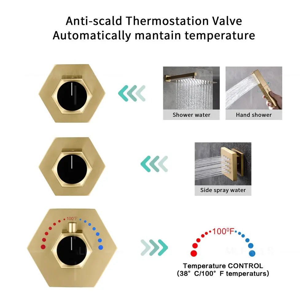 Indulge in pure elegance with the Gold Rainfall Shower Head with Handheld and Body Jets, a thermostatic shower set crafted to elevate modern bathrooms with style and safety. Designed with anti-scalding technology, it ensures a consistently comfortable water temperature while adding a touch of luxury through its brushed gold finish.