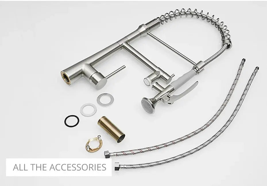 Bring professional performance and modern elegance into your home with the Commercial Pull Down Kitchen Faucet – 2 in 1 Brushed Nickel Brass Mixer Tap. Designed for style, durability, and convenience, this faucet combines hot, cold, and filtered water in one sleek unit. The brushed nickel finish resists fingerprints and corrosion, while the solid brass body ensures long-lasting performance.