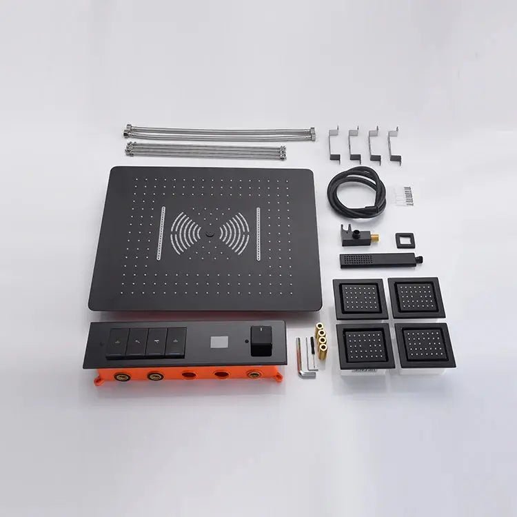 Transform your daily shower into a spa-like escape with our Black Ceiling Mounted Thermostatic Shower System. Featuring a 304 stainless steel rainfall head, brass handheld shower, and waist-level body jets, it delivers luxury, comfort, and precision control. The innovative mist atomizing function with LED light creates a relaxing, modern atmosphere, while the durable cartridge guarantees long-lasting performance (500,000+ uses). Perfect for elevating any contemporary bathroom.