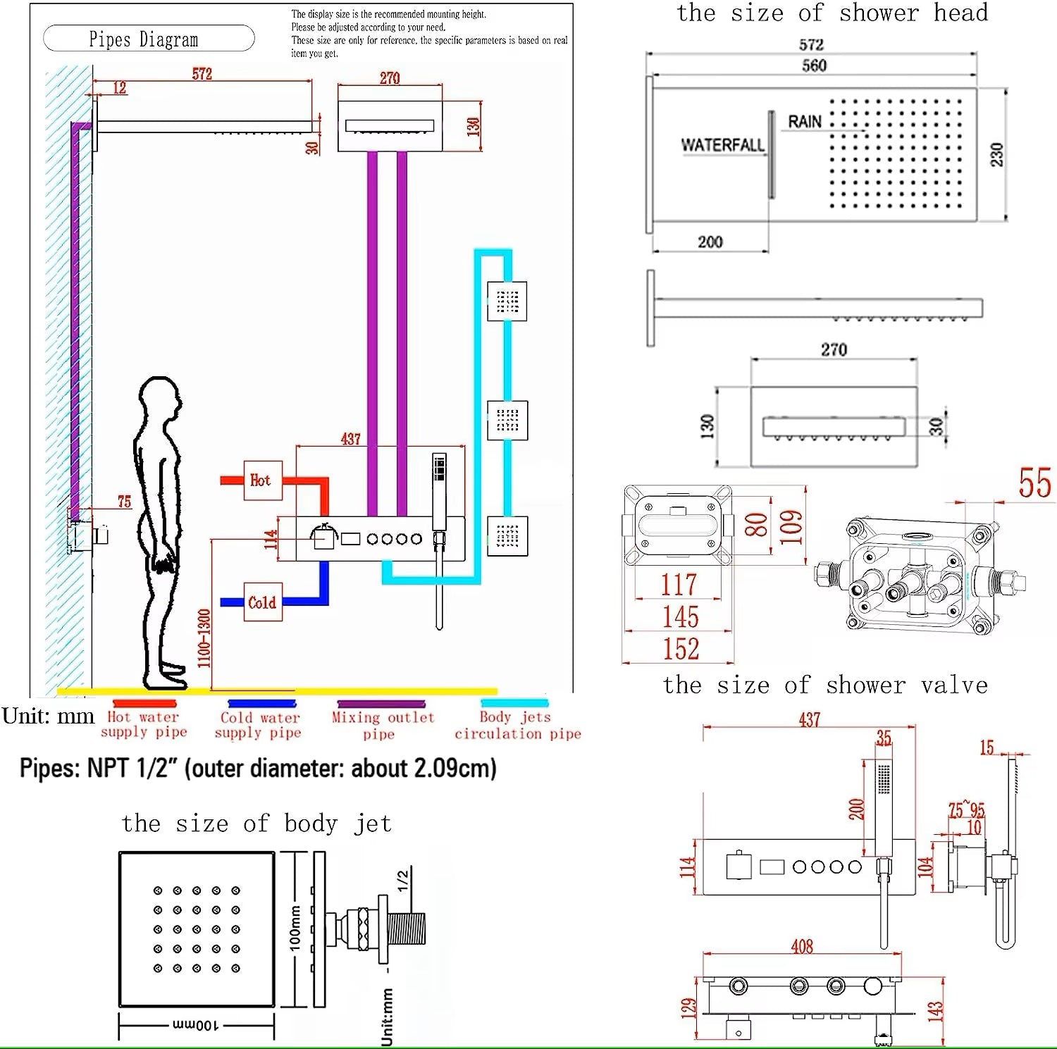 The LuxStream Waterfall Shower System (Model HD-DAC-30) is a high-end, contemporary shower solution designed for modern bathrooms. Crafted from polished brass with a ceramic valve core, this system ensures durability and sleek aesthetics. It features a thermostatic faucet with a triple-handle control and a slide bar for enhanced convenience. Offering both hot and cold water functions, the rain spray pattern adds a luxurious feel to your shower experience.